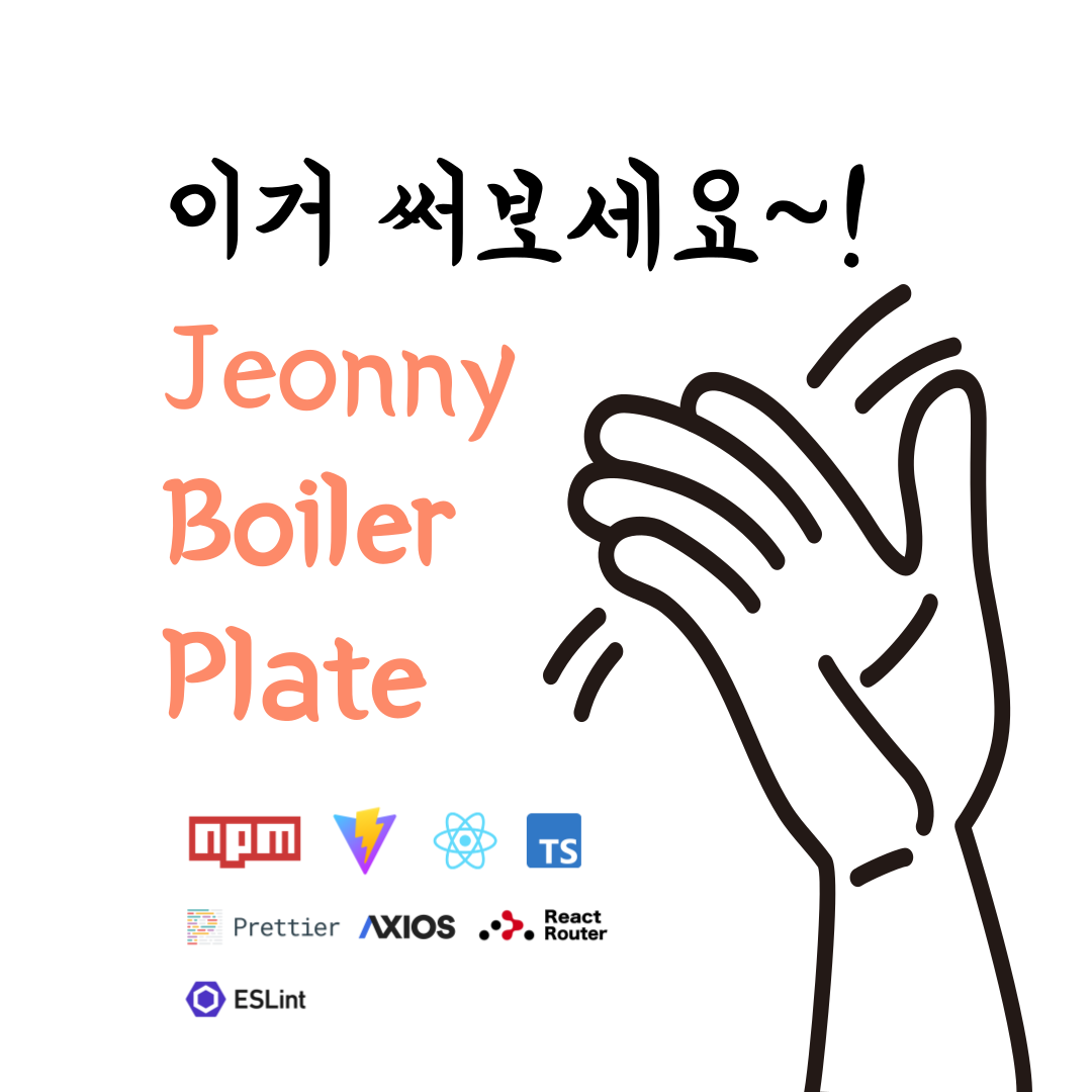 Jeonny-Boilerplate ? vite를 활용해 React + Typescript 개발 환경(프로젝트)를 생성합니다. 대부분의 리액트 프로젝트에서 기본적으로 사용되는 라이브러리가 포함되어있고, 코드 포맷팅을 돕기 위한 도구들도 추가되어 있습니다. npm에 배포되어 있어서, 누구든 쉽고 빠르게 사용할 수 있습니다. https://www.npmjs.com/package/jeonny-boilerplate 왜 만들었나요? 매번 새로운 프로젝트를 진행할 때마다, vite, cra로 프로젝트를 생성하고, eslint, prettier, 기타 라이브러리들을 추가적으로 설치하는 과정이 번거로웠습니다. 특히 eslint, prettier는 설정 과정에서 종종 에러가 발생하기도 해서, 시간을 더욱 잡아먹곤했습니다...